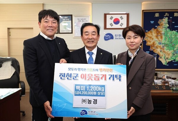 [한익환 기자] (주)농경의 구자균 대표는 부인 심윤희 전무와 함께 18일, 진천군청을 방문해 쌀 1,200kg(420만원 상당)을 기부했다.