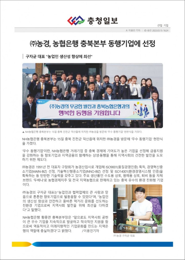 NH농협은행 충북본부(본부장 황종연, 사진 앞줄 왼쪽 세번째)가 토종 농자재 회사인 ㈜농경(대표 구자균, 〃 두번째)을 ‘우수 동행기업’으로 선정하고 동행을 약속했다.